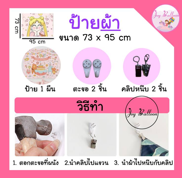 อุปกรณ์ในชุด 1. ป้ายผ้า 1 ผืน 2.ตะขอ 2 ชิ้น 3.คลิปหนีบผ้า 2 ชิ้น